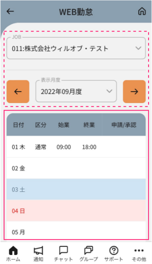 TOP画面の「WEB勤怠」もしくはメニューバー>申請する>WEB勤怠をクリックする。